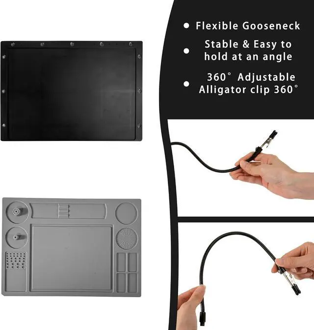 Adjustable Metal ArmsThe heavy duty Helping Hand has 6 adjustable metal neck arms and a strong base. 4 adjustable 11.22 -inch and 2 adjustable 13.39 -inch metal gooseneck arms (solder helpers), and 11 extension arm fixing holes that can be fixed at different positions on the bottom plate according to requirements, which can be freely combined and matched.