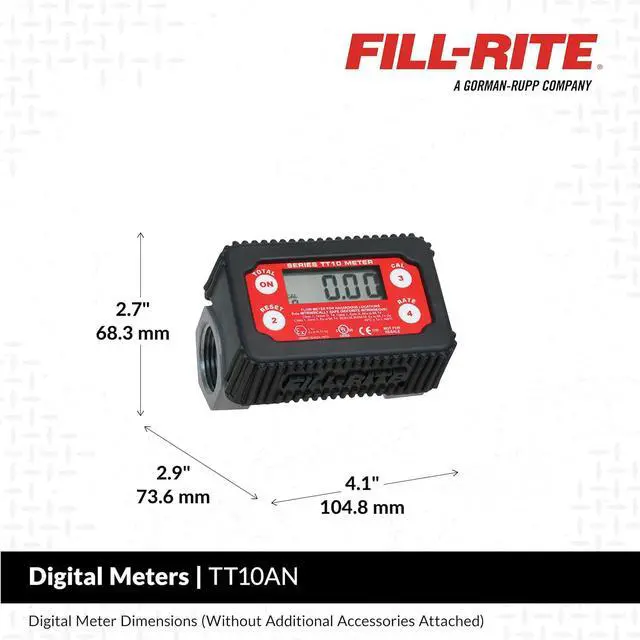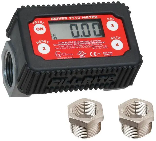 The TT10AN is built with an aluminum housing for metering diesel, gasoline, kerosene, B20, and E15. Mount it straight off the pump or at the end of the hose, the TT10 meter is flexible in its use, not to mention it is the only meter in its class with UL/ATEX listed electronic and mechanical components. Capable of measuring fluids in gallons, liters, quarts, pints, or ounces, each meter comes with a 4 digit display. This meter is equipped with NPT threads and is designed to register 2-35 gallons per minute at +/-1% accuracy.