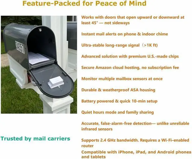 45° Activation Angle Upward or Downward Only - The mailbox alarm system is designed to trigger only when the mailbox door opens at least 45 degrees upward or downward. It does not support doors that open sideways (left or right), so please check your mailbox design before purchasing.