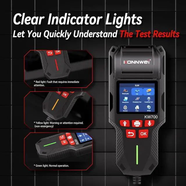 Easy-Read Lights for Quick Results KW700 auto battery load tester is equipped with 3 colors of indicator lights. Red light represents Fault that requires immediate attention. Yellow light represents Warning or attention required. (non-emergency). Green light represents Normal operation.