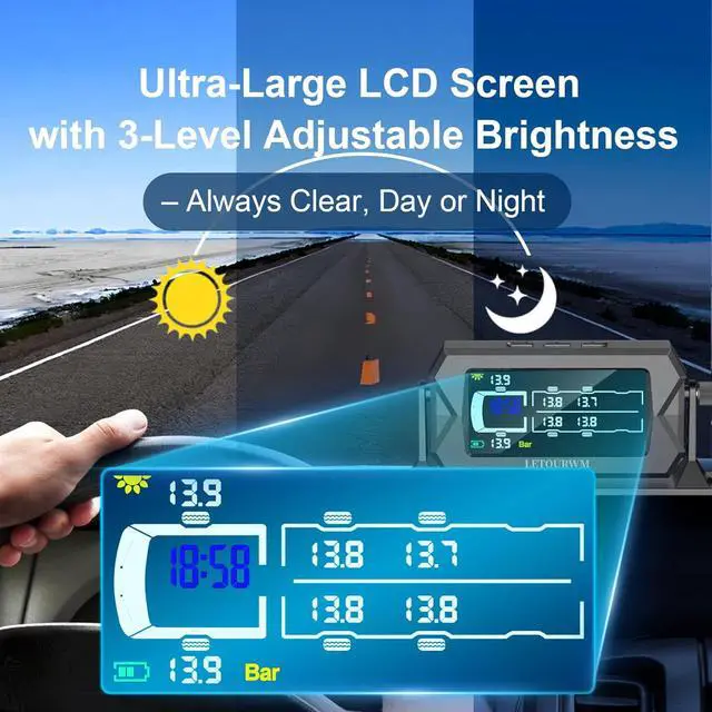 LCD Display: 3× larger than standard screens, with a built-in clock for convenience. Bright and clear visibility day or night, with a rotating bracket for optimal viewing angles.