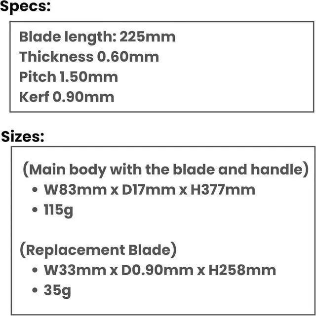 Specs: Blade Length 225mm, Pitch 1.5 mm, Thickness 0.60 mm, Kerf 0.90 mm