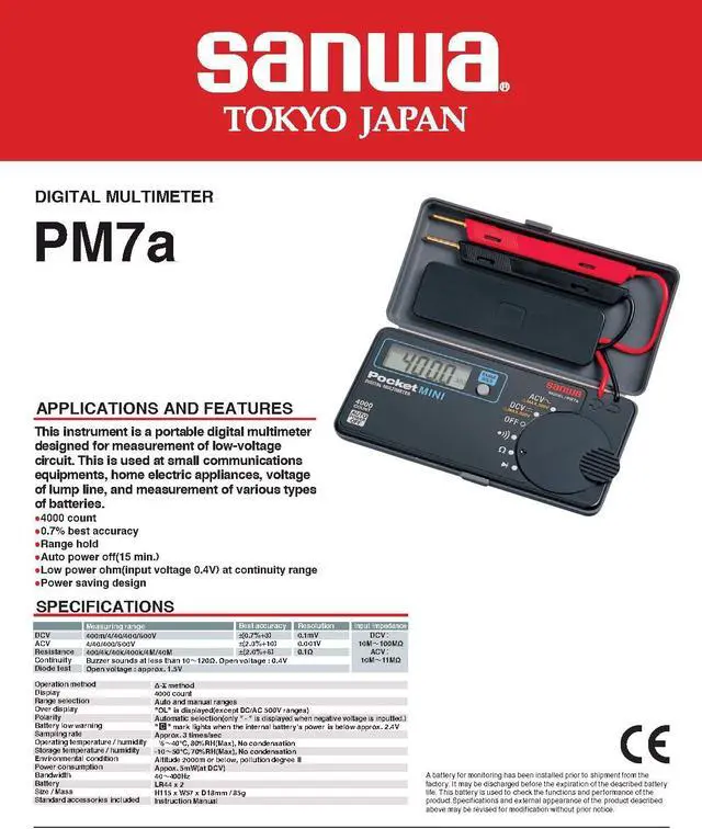 Sanwa PM7A Pocket mini Size Portable Multimeter DMM 4000 Count DC AC with Integrated Protective case Japan quanlity(PM7a)