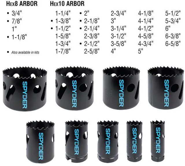 This 11-piece kit contains 7 hole saw bits (3/4, 7/8, 1-1/8, 1-1/2, 2, 2-1/8, and 2-1/2-inch), 2 pilot bits (Hex8 and Hex10), 2 arbors (Hex8 and Hex10), and a hard storage case.