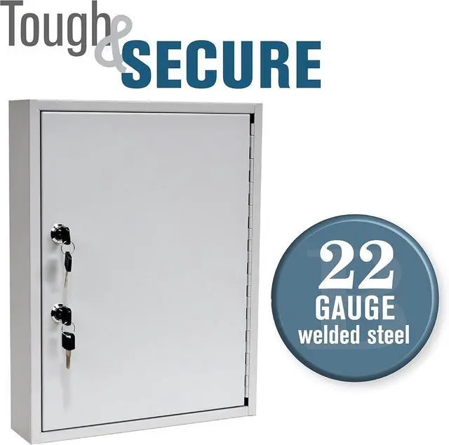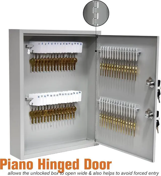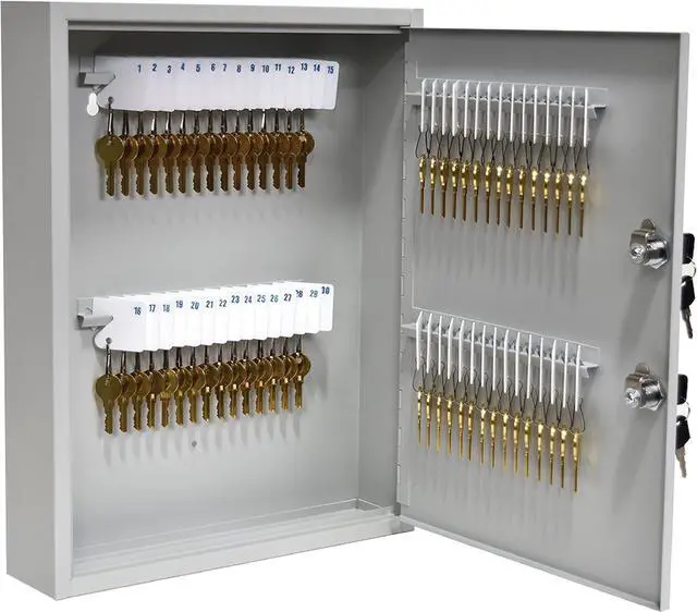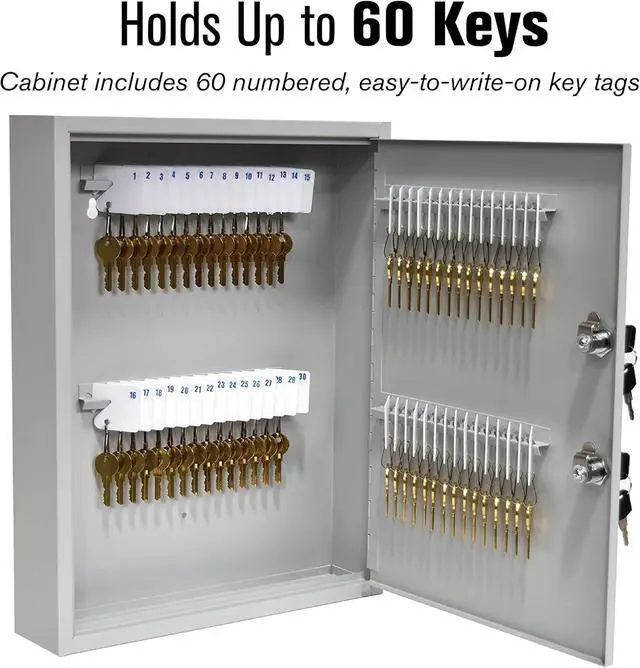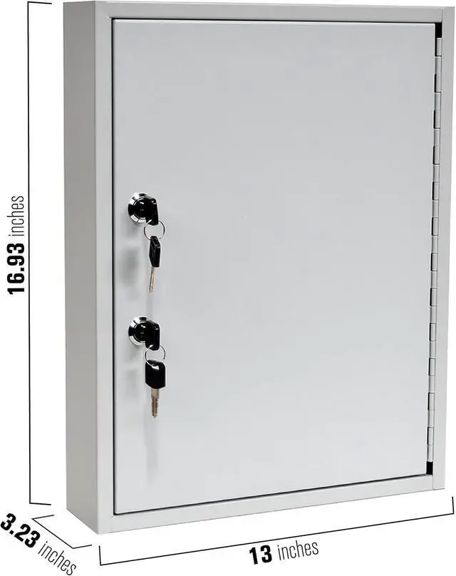 DIMENSIONS: The key storage box measures 13-inches in width, 16.93 -inches in height, and 3.23 -inches in depth. It includes 60 numbered key tags, 6 out key on yellow tags, and mounting hardware.
