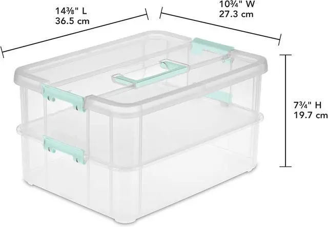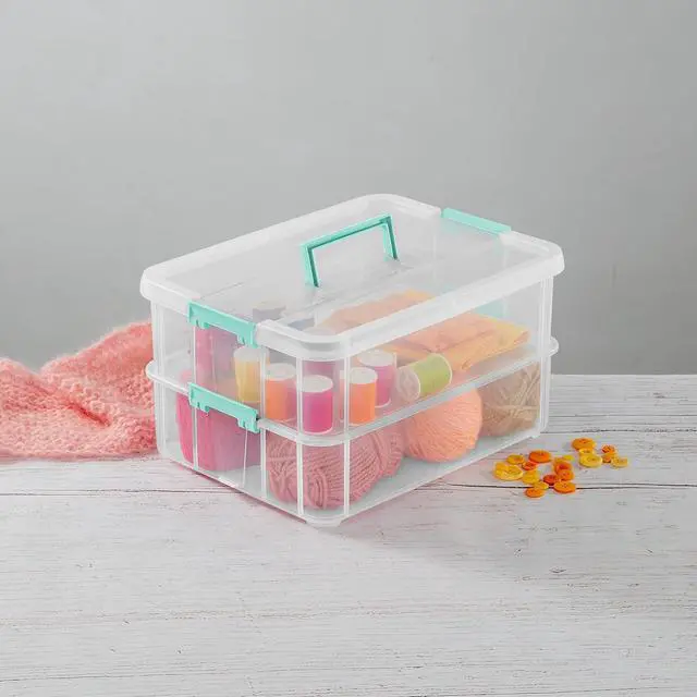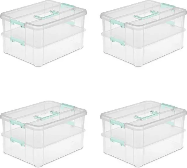Stack and Carry 2 Layer Handle Box, Stackable Plastic Small Storage Container with Latching Lid, Bin to Organize Crafts, Clear, 4-Pack