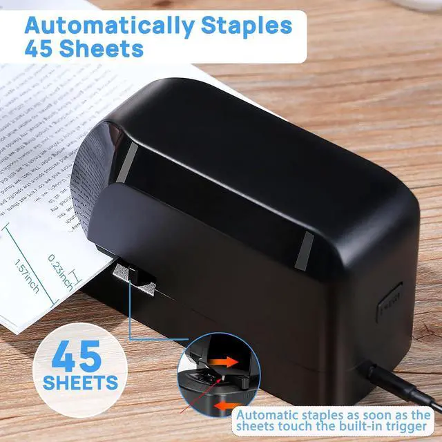 AUTO BINDING: Documents piling up? Help you free your hands, 45 pages sensing in 1 second. Say goodbye to the hassle and loss of wrists of manual staplers, our electric automatic stapler requires no effort to press the stapler, as long as the built-in paper detection system detects the paper, our sensor will automatically bind the paper. Make stapling a breeze with the Electric staplers automatic operation. (Our staplers use standard staples)
