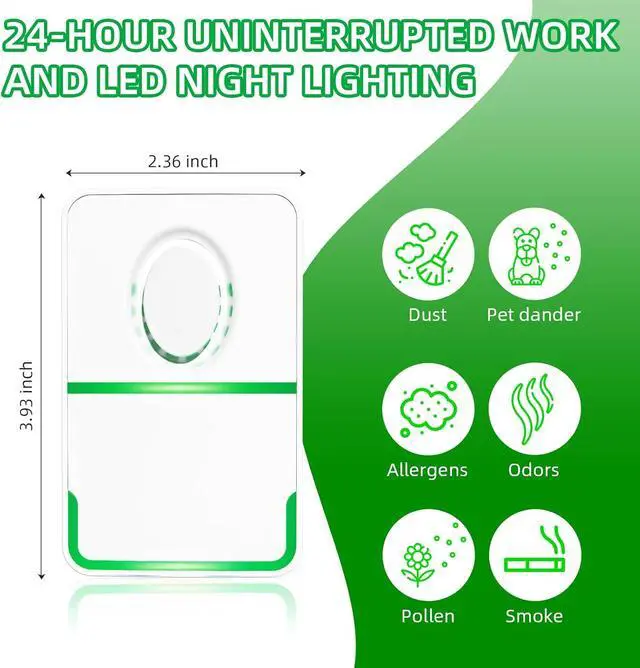 • Experience truly fresher indoor air with our advanced plug-in negative ion air purifier. Utilizing powerful electric brush technology, it continuously releases a high concentration of negative ions. These ions actively seek out and neutralize airborne pollutants such as smoke, dust, allergens, and stubborn odors from pets or cooking.