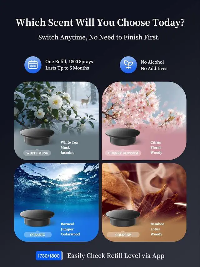 Includes Long-Lasting 6-month essential oil refillsCar diffuser comes with two essential oil refills. The built-in counter allows for 1800 sprays per refill. Choose from Soothing, Strong, or Customizable Spray Intervals