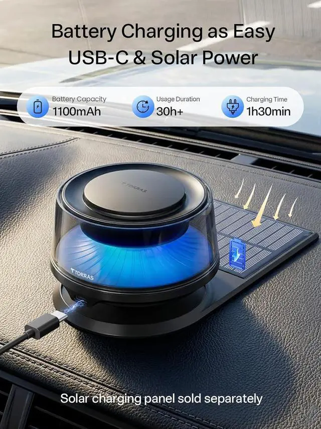 Flexible chargingCar fresheners features an 1100mAh lithium battery, supporting type-C and solar charging. Fully charged, can be used continuously for 30 hours, Solar power completely eliminates the hassle of manual charging