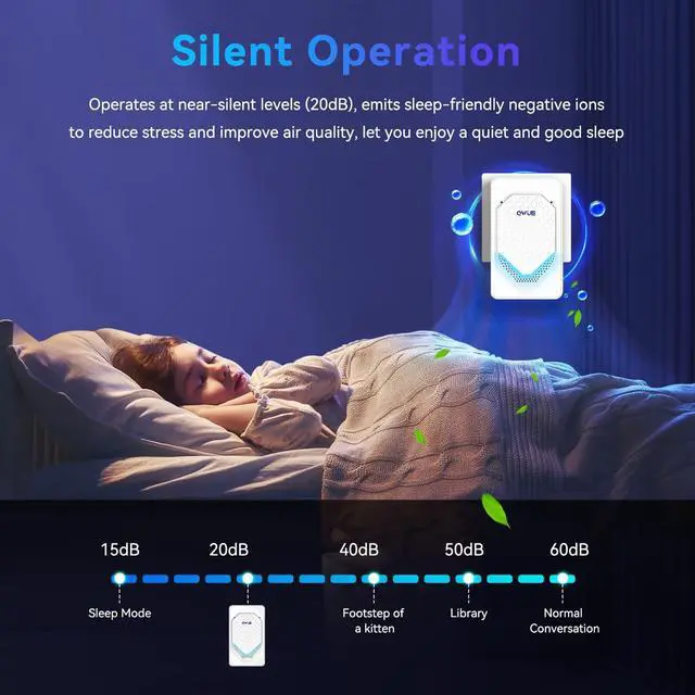 Quiet Operation: Our purifier operates at near-silent levels (20dB) to create a tranquil sleep environment. This purifier emits sleep-friendly negative ions to reduce stress and improve air quality, creating an optimal environment for deep sleep in bedrooms or focused productivity in workspaces. You can enjoy fresh air easily