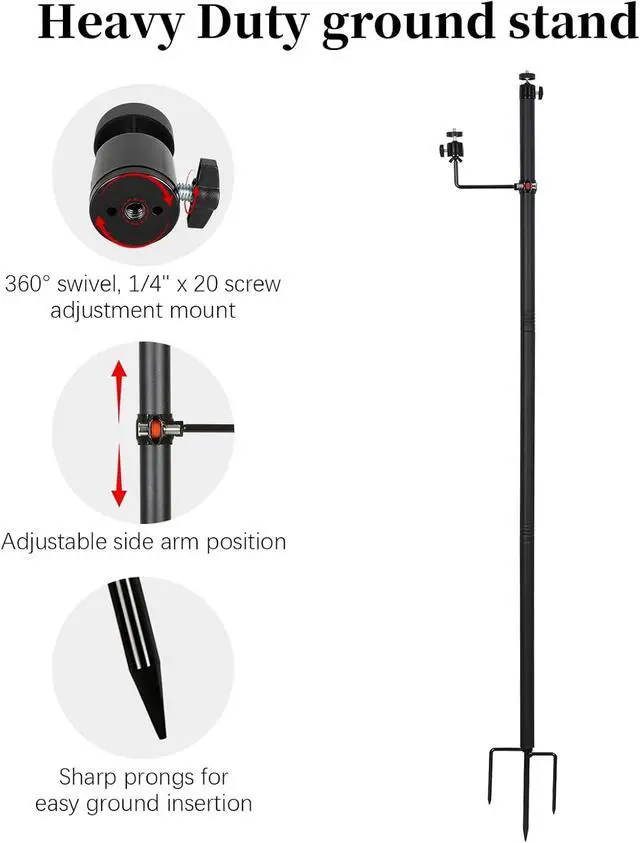 Complete Mounting Kit Ready to Use Includes ground stake, adjustable side arm, two swivel mounts, and installation wrench. No extra tools needed.