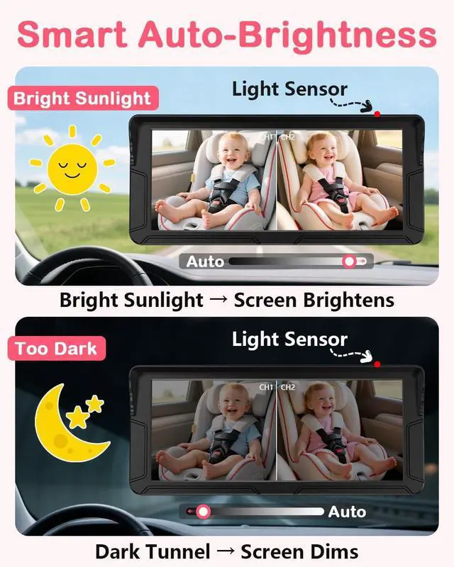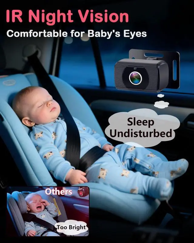 CRYSTAL-CLEAR 1080P HD RESOLUTION & NIGHT VISION Experience exceptional clarity day or night with car camera for baby. The 1080P HD resolution ensures vibrant images, while infrared night vision technology provides reliable visibility in low-light conditions. Drive confidently at night with an eye-safe, glare-free view, designed to protect your child's sensitive eyes while ensuring clear monitoring at all times