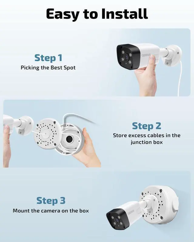 Easy InstallationStart by securing the camera junction box to the wall with screws. Next, run the extra wiring through the center hole of the security junction box. Finally, snap the cover on, and youre all set! This simple process lets you easily mount your security camera while keeping your wiring neat and tidy.