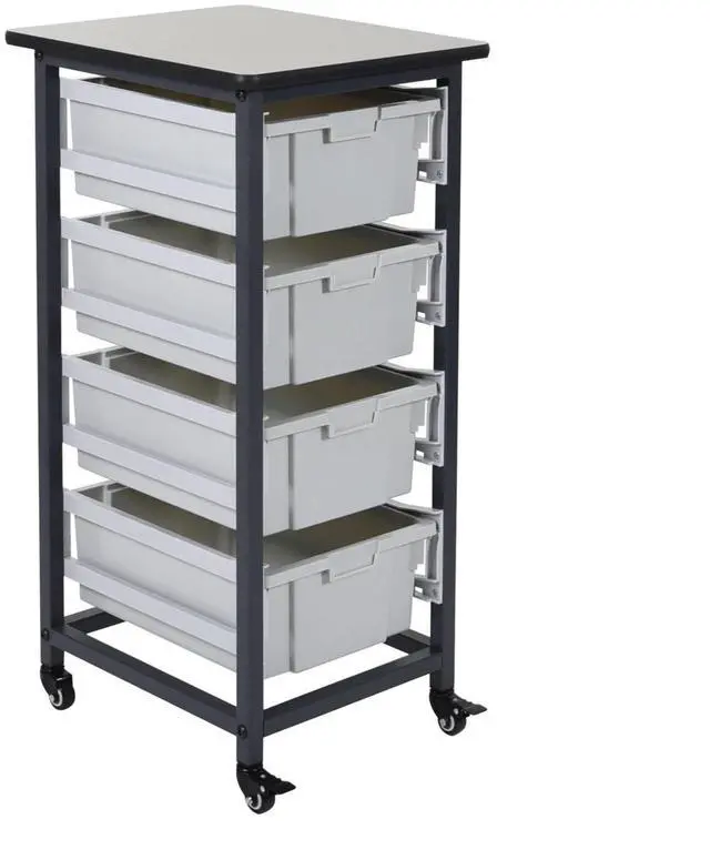 Conveniently store and systematize your daily essentials in Ergode Mobile Bin System The spacious gray bins are available in two sizes and include an area for standard labels that dually operates as a handle for easy accessibility to stored items Choose from Ergode five storage bin options and add mobility and ease to your storage drawers Versatile and functional storage units are ideal for schools garages or industrial facilities Organize and stack supplies in four 6 deep tubs Single row steel frame is constructed for long lasting use Built in locking feature prevents bins from falling out of place Simple organization system with area for standard labels Flat top surface provides a work area or additional storage Four casters allow smooth maneuverability two locking brake s give stability for stationary use Ships ground Overall Dimensions 17 125 W x 20 D x 37 5 H Bins 12 25 W x 16 75 D x 6 H