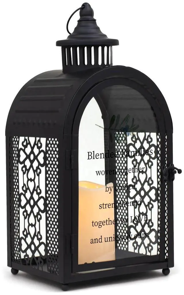 Blended Families Woven Together By Choice Strengthened Together By Love And Uniquely Ours Exquisite Arch Shaped Large Black Metal Lantern Features Lacy Open Filigree Sides Along With Large Glass Window In Back And On The Front Door Nicely Detailed Chimney Accent Topped With Round Carrying Handle Is The Finishing Touch Glass On Door Displays Scripture Verse And Design While Vintage Curved Latch Holds Door Securely Closed Lantern Is Illuminated From Within By The Soft Flickering Of A Pillar Style Led Candle Included Size Of Lantern Is 16 5 High 7 5 Wide x 6 Deep Candle Uses 3 AAA Batteries Not Included