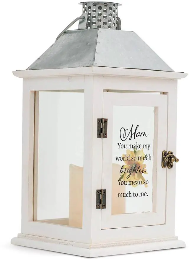 Mom You Make My World So Much Brighter You Mean So Much To Me Elegant White Wood Lantern Is Topped In D corative Silver Metal With Industrial Flute Accent Sides Are Clear Glass All Around With An Inspiring Scripture Verse On Front Door Panel It Is Illuminated From Within By The Soft Flickering Of A Pillar Style Led Candle Included Lantern Makes A Beautiful D cor Accent That Fits Well In A Variety Of Settings Size Of Lantern Is 12 25 High 6 5 Wide x 6 5 Deep Candle Uses 3 AAA Batteries Not Included