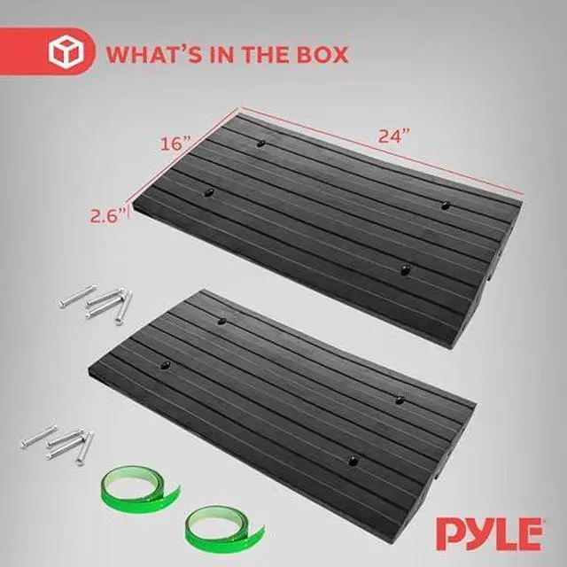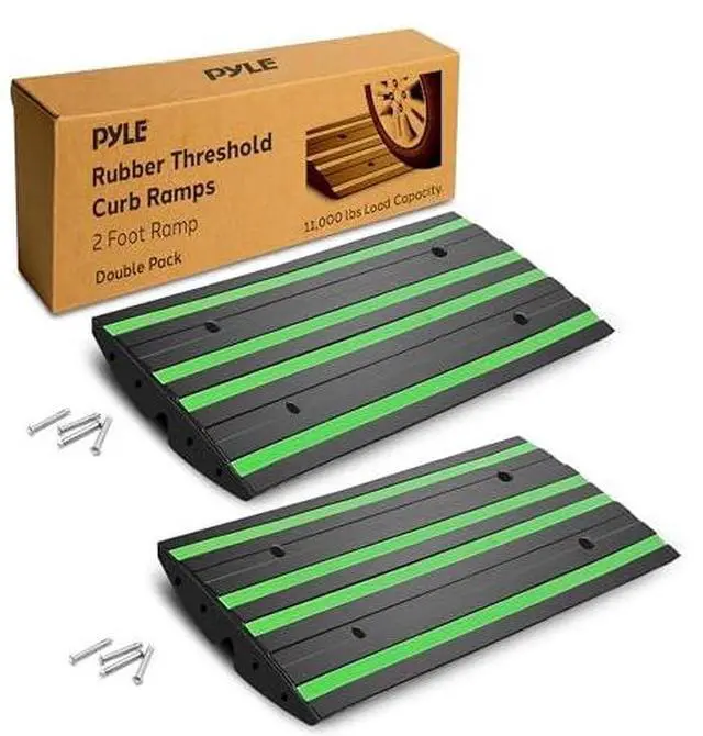 Pyle 2 Ft. Rubber Threshold Curb Ramp Set, Green Reflective Strip for Driveways, Non-Slip Marine Grade Rubber, Pack of 2 Heavy Duty Car Ramps for Trucks, RVs, Forklifts, 24.0x 16.0 x 2.6 Inches
