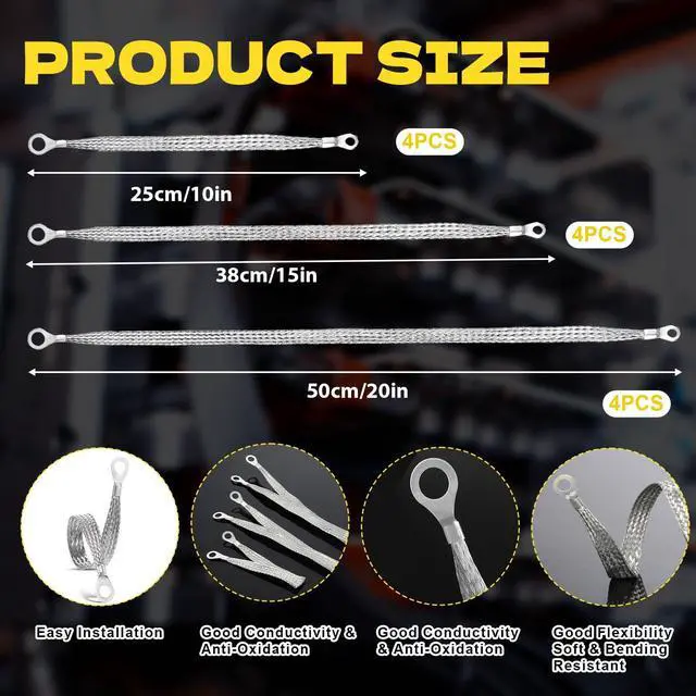 Multiple Size Options you will receive 12 engine grounding straps, sufficient quantity and size, each size has 4 grounding straps, our package includes ground straps in varying lengths including 10, 15, and 20 inches; With a hole inner diameter of 8 mm and an outer diameter of 12.7 mm, these straps are designed to accommodate various automotive connection needs