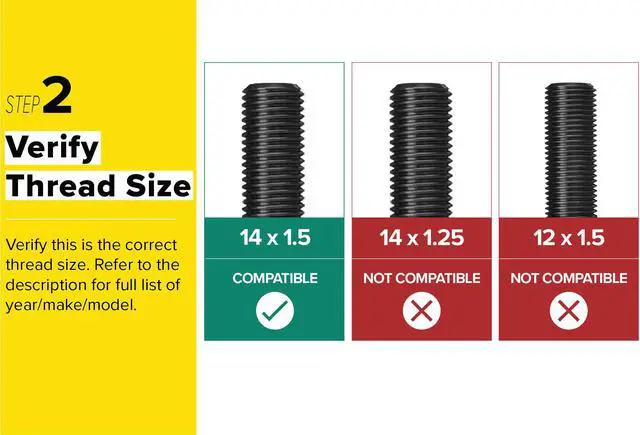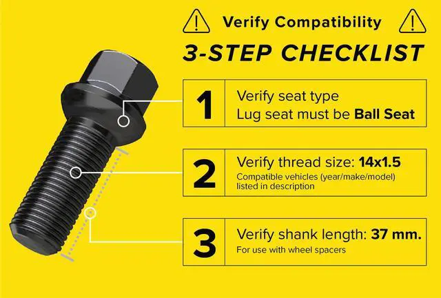 [ NOTE ] Buyers responsible for confirming the Thread Size, Shank Length, and Seat needed before purchasing. Installing incompatible hardware can cause damage to vehicle components and may cause lug bolts to loosen while driving.
