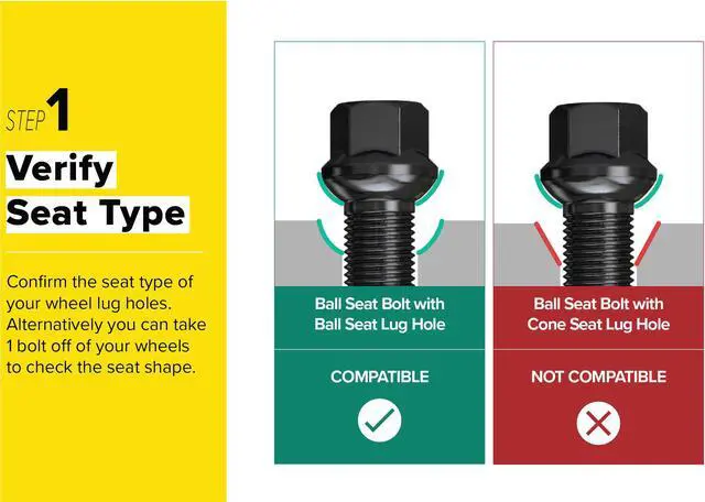 - WARNING: VERIFY VEHICLE LUG BOLT SIZE, SEAT AND THREADS. Check your vehicle's bolt thread size, as various years/models come with different size bolts. These are Ball Seat R12 shaped bolts. Make sure your wheels bolt seat have this seat type. See Diagram for Help. During Installation, ensure that your bolts get 5-8 full turns before tightening.