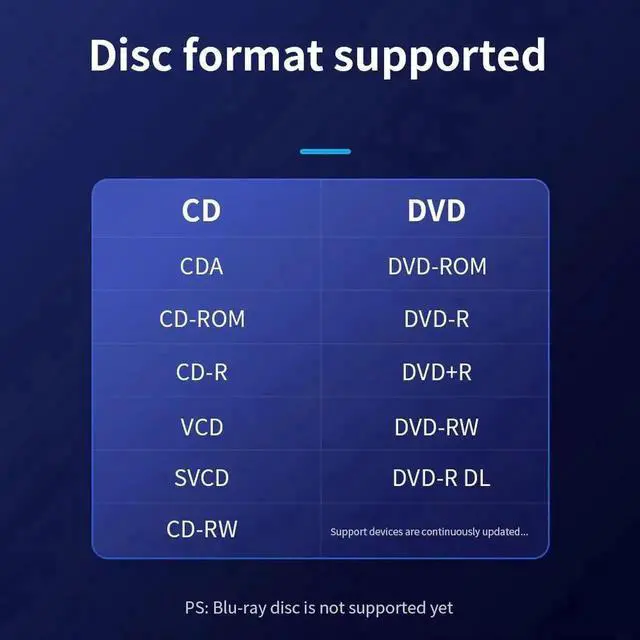Supported formats: DVD-ROM, DVD-Video, CD-R / RW, CD-ROM / XA, CD-ROM, CD-EXTRA, CD-TEXT