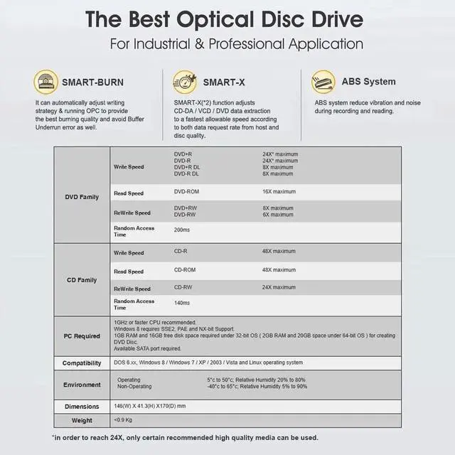 • [Smart- X] SMART-X function adjusts CD-DA / VCD / DVD data extraction to a fastest allowable speed according to both data request rate from host and disk quality. Support power saving mode by Lite-On power test program.