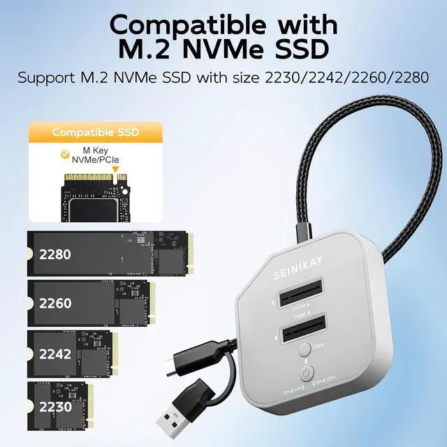 • Universal CompatibilityThis M.2 SSD copier works with both NVMe M.2 SSDs (2280/2260/2242/2230 sizes) Use it as a standalone offline cloner or connect to your computer for added flexibility.
