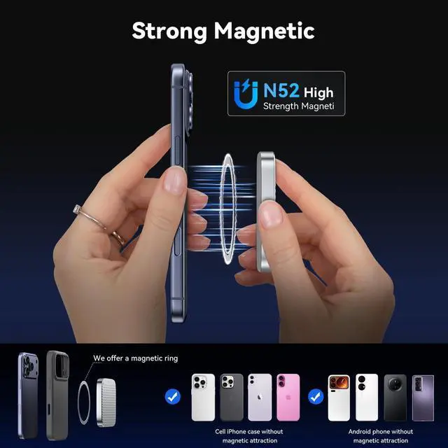 Magnetic External SSD. Snap securely to your smartphone for stable handheld shooting and effortless on-the-go use. An extra magnetic ring extends compatibility with non-MagSafe all your Type-C Android phones, iPhone 15/15 Pro/15 Pro Max, iPhone 16/16Pro/16E,iPhone 17/17 Pro/17 Pro Max tablets, iPad Pro, Macs and USB-A computers, game consoles, car audios, and more (For USB-C iPhones/iPads only)