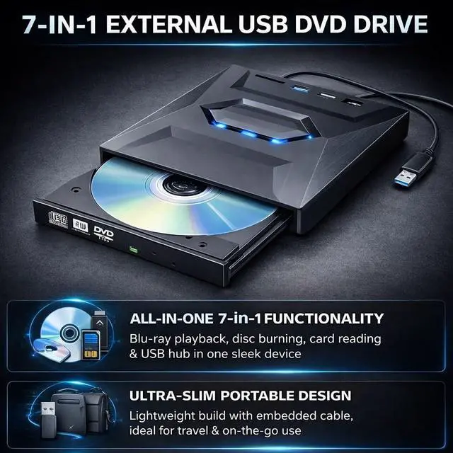 All-in-One 7-in-1 Functionality: This 7-in-1 external usb dvd drive & blu-ray player combines Blu-ray playback, DVD/CD burning, SD/TF card slots, and USB ports into one sleek device. Perfect as an external drive for laptop, it handles reading, writing, and ripping with ease