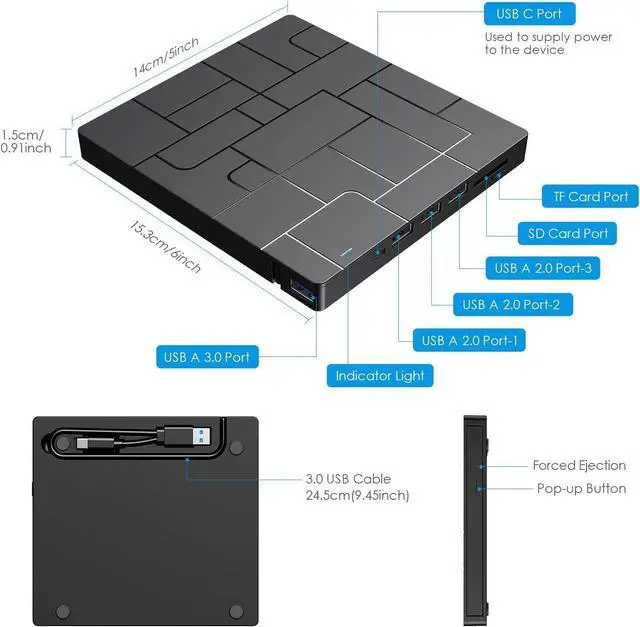 [6-IN-1 INTEGRATED DESIGN] The external DVD drive not only can be used to read or burn discs, but also can be used as a USB hub with seven ports, including one USB 3.0 port, three USB 2.0 ports, one TF slot, one SD card slot, and one Type-C port.