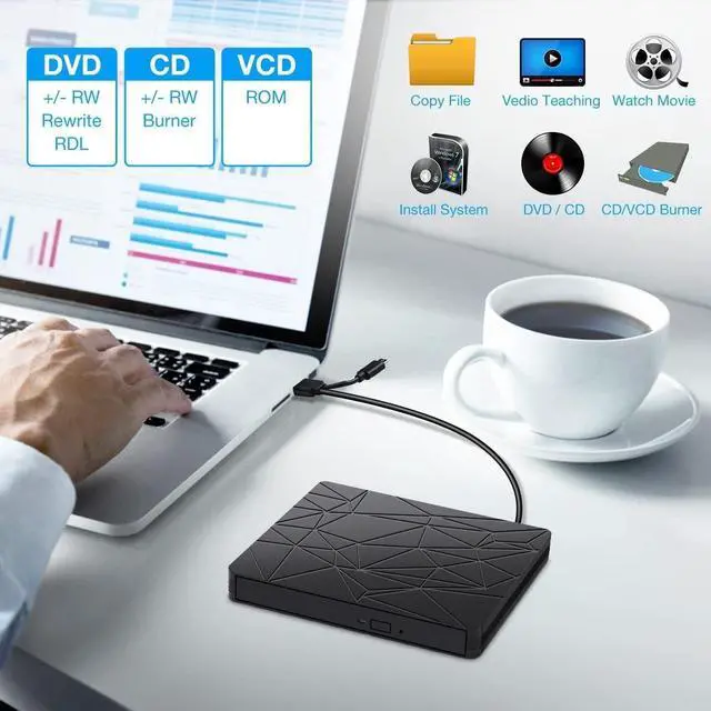 [Plug & play and Wide Compatibility] Easy to use, dont need any software and it powered by USB port, will work once you plug it into your laptop. Compatible with Windows XP / Win 98 / Win 7 / Win 8 / Win 10 / Vista,OS 8.6 or above. Supports CD, CD-R, CD-RW, CD-ROM, DVD±R, DVD-R DL, CDA, DVD-ROM, VCD and SVCD.