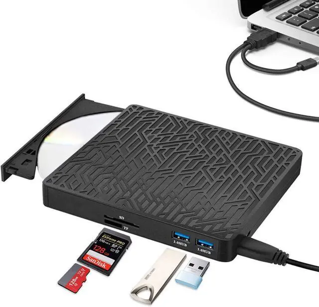 3 in 1 External Drive - The CD DVD-RW drive has 2-Port Hub USB 3.0,with Type C and USB 3.0 interface,2-SD/TF card slot,brings you faster data transfer rate and stable performance with strong fault tolerance
