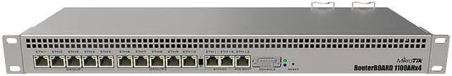 RB1100AHx4, 13x Gigabit Ethernet ports Router, powered by Annapurna Alpine AL21400 CPU with four Cortex A15 cores, clocked at 1.4GHz each, for a maximum throughput of up to 7.5Gbit. The device supports IPsec hardware acceleration (up to 2.2Gbps with AES128).