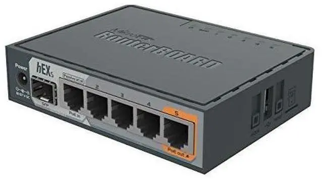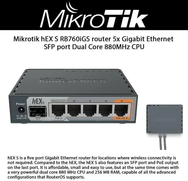 Details: hEX S is a five port Gigabit Ethernet router for locations where wireless connectivity is not required. Compared to the hEX the hEX S also features an SFP port and PoE output on the last port. It is affordable small and easy to use but at the same time comes with a very powerful dual core 880 MHz CPU and 256 MB RAM capable of all the advanced configurations that RouterOS supports. The device has a USB 2.0 PoE output for Ethernet port #5 and a 1.25G bit/s SFP cage. IPsec hardware encryption (~470 Mbps) and The Dude server package is supported microSD slot on it provides improved r/w speed for file storage and Dude.