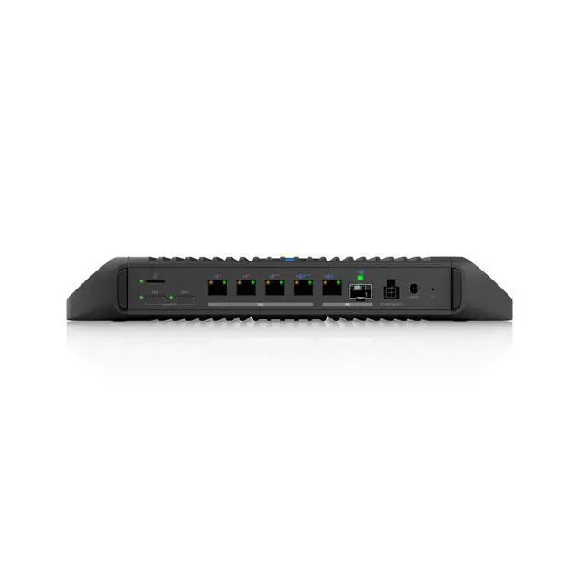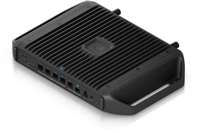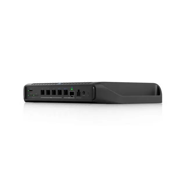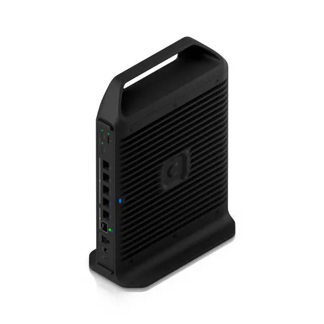 Ruggedized, fanless 10 GbE UniFi Cloud Gateway delivering 350W of total system power for high-density PoE deployments, with advanced routing capabilities and microSD storage for full UniFi application support.