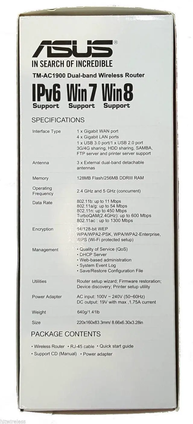 Package Includes: -1x Asus Dual Band Wireless Router TM-AC1900 -1x Power adapter. -1x RJ-45 Ethernet Cable. -3x Wi-Fi antennas.