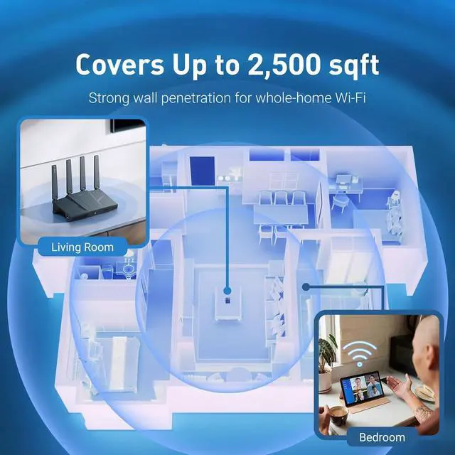 Extensive CoverageExperience seamless Wi-Fi connection throughout your home and workplace with performance designed for extra long range WiFi, modern connectivity. This advanced router system delivers strong, reliable signal strength for up to 2, 500 square feet of coverage.