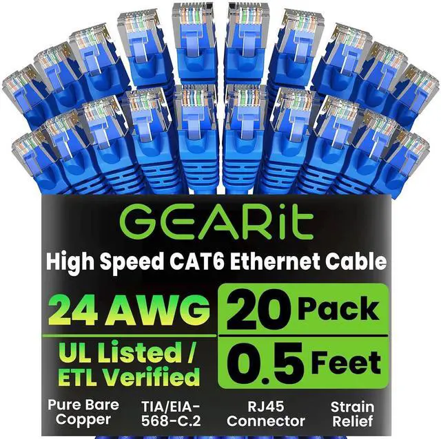 High-Performance Cat 6 Ethernet Cable Pack GEARit' s 20-pack of 0.5 ft Cat6 ethernet patch cables features 24 AWG UTP stranded conductors twisted in an X-structure spline to minimize crosstalk and deliver full 10 Gbps bandwidth - future-proof network cables for home, office, data-center, and server use.