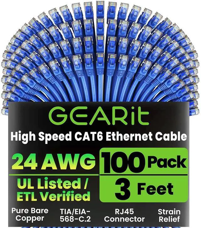 High-Performance Cat 6 Ethernet Cable Pack GEARit' s 100-pack of 3 ft Cat6 ethernet patch cables features 24 AWG UTP stranded conductors twisted in an X-structure spline to minimize crosstalk and deliver full 10 Gbps bandwidth - future-proof network cables for home, office, data-center, and server use.