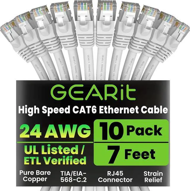 GEARit Cat 6 Ethernet Cable (10-Pack 7 Feet) Cat6 Network Patch, 10Gbps, RJ45, Snagless Cord, Gold-Plated Connectors, Internet for PC, TV, Tablet, Router, Printer, Servers, IT Data Center - White