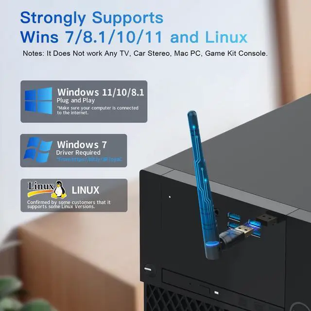Plug n Play & Compatible Devices: This BT54H Bluetooth 5.4 Dongle is developed for Windows 11/10/ 8.1 /7 and Linux Non-Bluetooth PC/Laptop/Desktop only and does not support other systems. No driver installation is required under Windows 11/10/ 8.1 Linux OS (Internet Required). Supports Win7 (Driver required and can be downloaded from website for free).