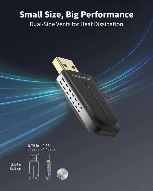 Compact & Cool: At just 2.04 × 0.78 × 0.35 in, this Bluetooth WiFi dongle fits easily into any setuplaptop, desktop, mini PC, or tower PC. Dual-side vent holes improve heat dissipation for long-term reliability