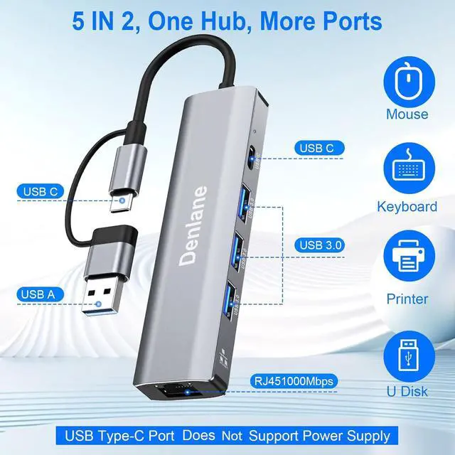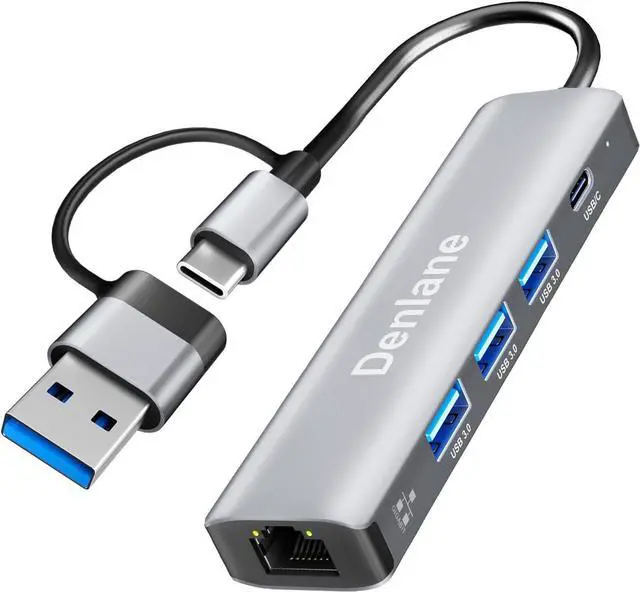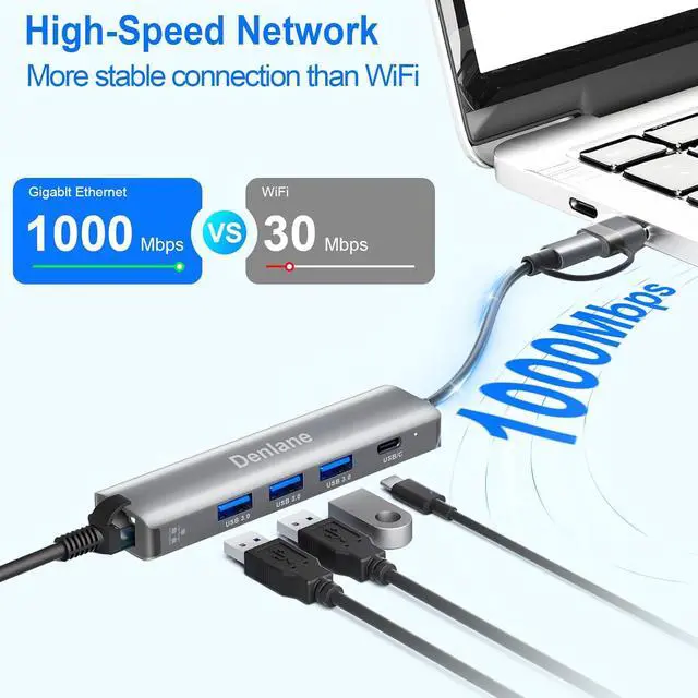 Organize Peripherals: Denlane USB hub/usb c hub totally has 4 USBA/USBC expansion ports, USB 3.0 provides 5Gbps data transfer speed. Backward compatible with USB 2.0 and 1.1. Ethernet hub allows you to get fast network, expand more peripherals, and easily and simply do what you like