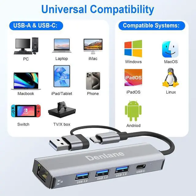 Wide Compatibility: Denlane usb hub with ethernet is compatible with variously systems Windows/macOS/ChromeOS/Linux/ Android/iOS/iPasOS/. It works seamlessly with laptops, desktops, tablets, smartphones, and other devices. Such as MacBook Air/Pro, usb-c iPad, Dell XPS, Surface Book, Pixelbook, Chromebook, Asus ZenBook, Lenovo Yoga 720/910/920, Samsung S8/S8 Plus/Note 8/Note 9, Samsung Tablet Tab A 10.5, Pixel/Pixel 2 and more