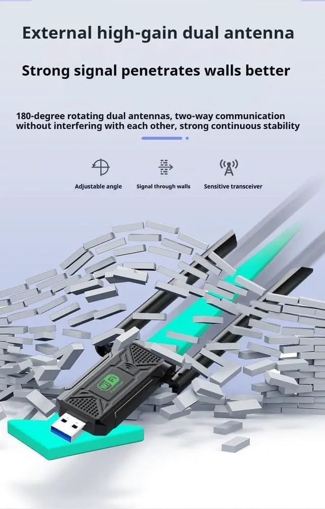 WiFi adapter with dual 2dBi high gain antennas, greatly enhance the WiFi signal reception and transmission strength to make wifi stable, 180° rotatable antenna provides stronger wireless transmission, can receive signals from any angle, it is recommended to tilt the antenna 40~60 degrees to get better wifi signal.
