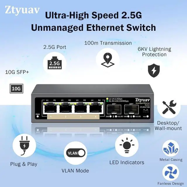 Plug and PlayUnmanaged 2.5G network switches, easy to install and use, just connecting power and devices. Two installation methods - desktop or wall mounted are acceptable.