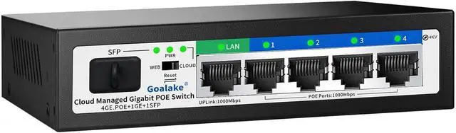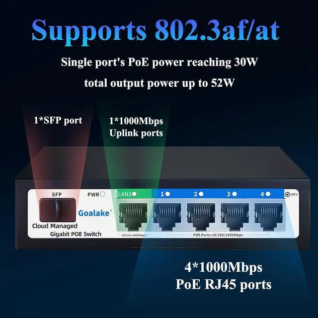 Port Gigabit Poe Switch: Goalake gigabit poe switch includes 4 port gigabit switch + 1 gigabit uplink +1 x 1.25G SFP. Compliant with IEEE 802.3 af/at standard, it can deliver up to 30W for each PoE port. Data, and power can be transferred on one single cable. It supports PoE power up to 52W for all PoE ports.