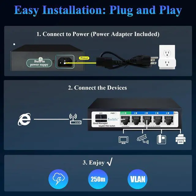 Active poe switch with VLAN: Our 4 port gigabit switch features VLAN mode, allowing you to isolate the 4 PoE+ ports from each other. This simplifies management and maintenance, prevents broadcast storms, avoids data confusion, and ensures a more stable wireless networking experience.