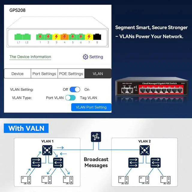 Smart Management Control Your Network from Anywhere: STEAMEMO 8 gigabit ports PoE+ switch Manage your network effortlessly with web interface, desktop software, or mobile app. Monitor real-time traffic, prioritize devices with QoS, and configure VLA